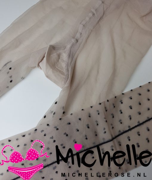 Deze panty is 20 denier en versierd met zwarte stipjes en een zwarte naad aan de achterkant.